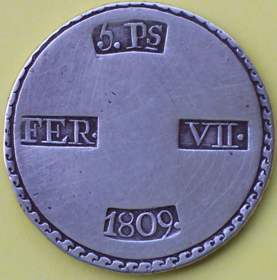 Con la ocupación napoleónica de fondo, Tarragona acuña este duro sólo en el año 1809. En el reverso el escudo de la ciudad.