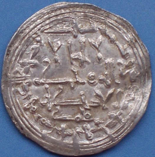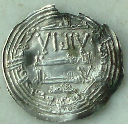 Por otra parte se le observa un intento de fragmentación desde las 3 a las 5 en su anverso. Se le aprecia incluso el lugar en que fue sostenido por unas tenazas. Y por fin el trozo desprendido en la parte superior. Ya sabemos que durante el califato no había moneda fraccionaria para las pequeñas compras; se usaban trozos de dirhams de diversos tamaños.