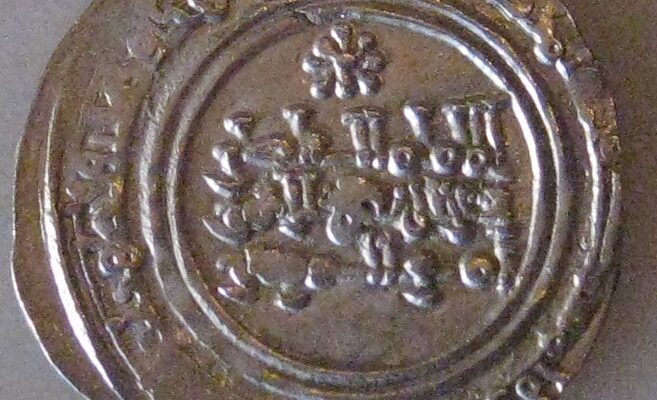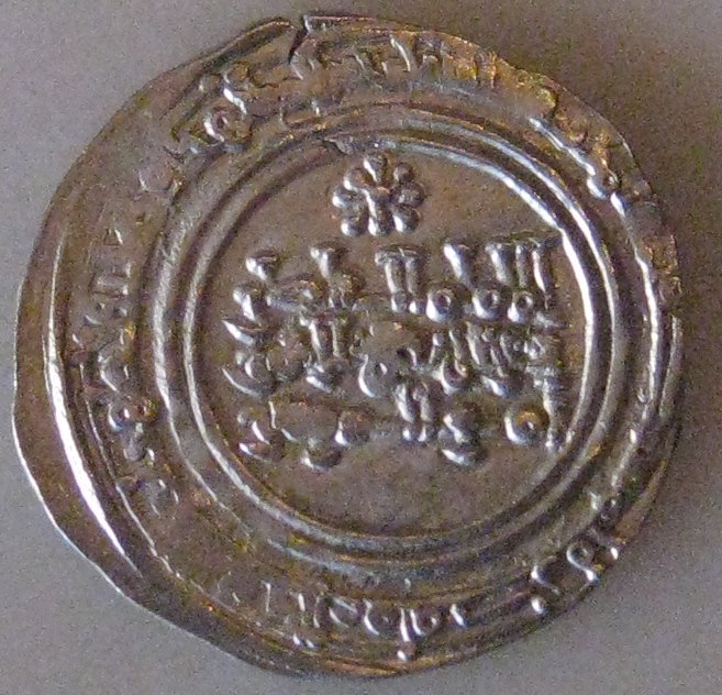 En estos años los adornos en los dirhams son espectaculares, no llegándose a superarse. En este caso tenemos dos adornos florales; el superior una ramita y en el inferior la flor de lis que en estos años empieza a ser habitual.