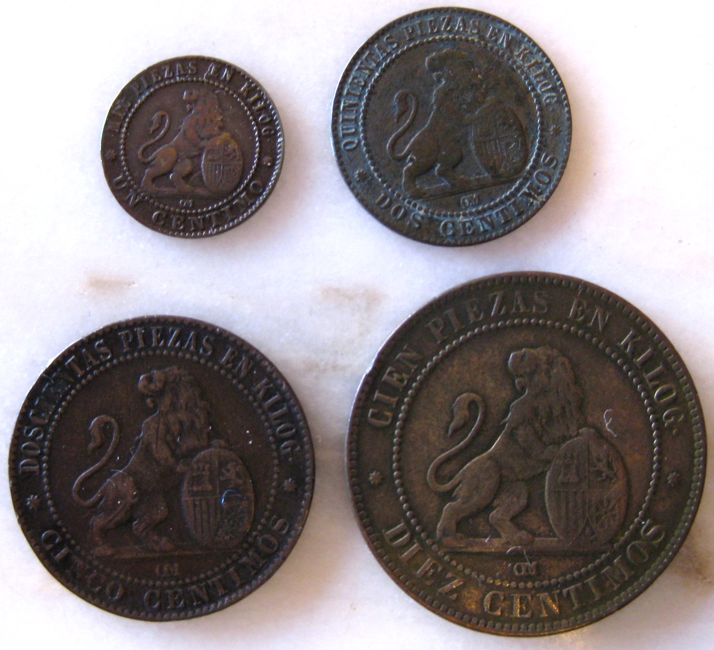 La serie de la foto, del Gobierno Provisional-Primera República, de 1870, tiene en su haber historias curiosas, entre ellas el nombre de “perragorda” para la mayor, la de 10 céntimos, pues en su cara tiene un león con una melena no muy abundante, lo que llevó al pueblo a confundirlo con una perra. Pues estaba cantado, los 10 céntimos “la perragorda” y los 5 céntimos “la perrachica”.